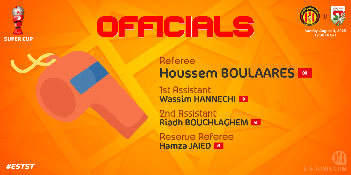 La direction nationale d'arbitrage a désigné l'arbitre Houssem Boulaares pour officier la finale de la Supercoupe de Tunisie 2024/2025 qui opposera dimanche soir l'Espérance de Tunis au Stadde Tunisien à partir de 17h15 au stade de Radès.
