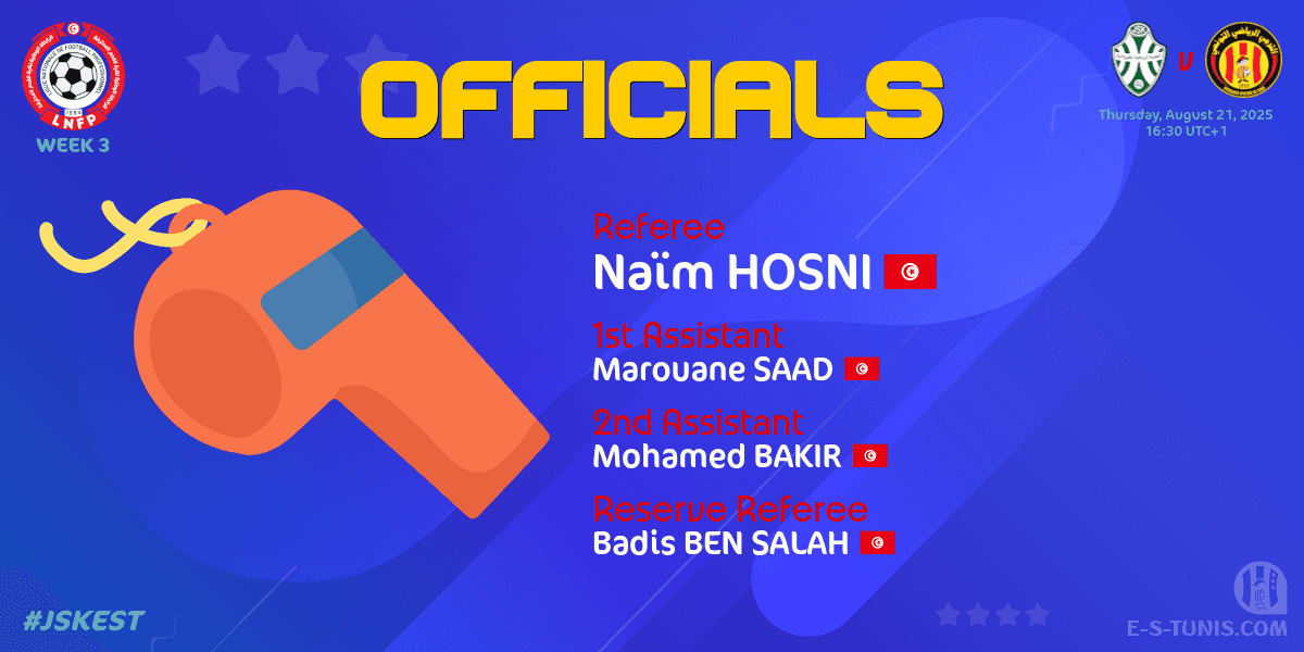 La direction nationale d'arbitrage a désigné l'arbitre Naïm Hosni pour officier la rencontre de la 3e journée de la Ligue 1 2025/2026 qui opposera jeudi après-midi l'Espérance de Tunis à la JS Kairouanaise à partir de 16h30 au stade Hamda Laaouani de Kairouan.