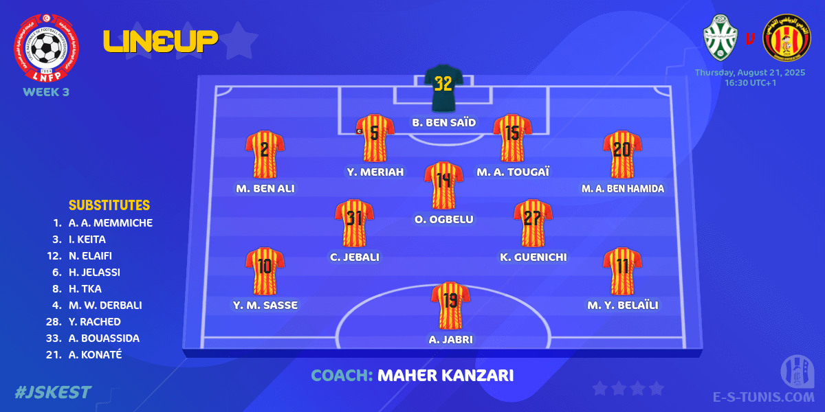 La formation sang et or qu'alignera le staff technique tout à l'heure face à la JS Kairouanaise pour le compte de la 3e journée de la Ligue 1 2025/2026 au stade Hamda Laâouani de Kairouan est la suivante : Ben Saïd, Ben Ali, Ben Hamida, Meriah(c), Tougai, Ogbelu, Guenichi, Jebali, Belaïli, Sasse et Jabri.