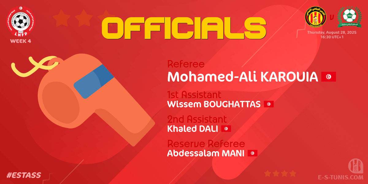 La direction nationale d'arbitrage a désigné l'arbitre Mohamed-Ali Karouia pour officier la rencontre de la 4e journée de Ligue 1 2025/2026 qui opposera jeudi après-midi l'Espérance de Tunis à l'AS Soliman à partir de 16h30 au stade de Radès.