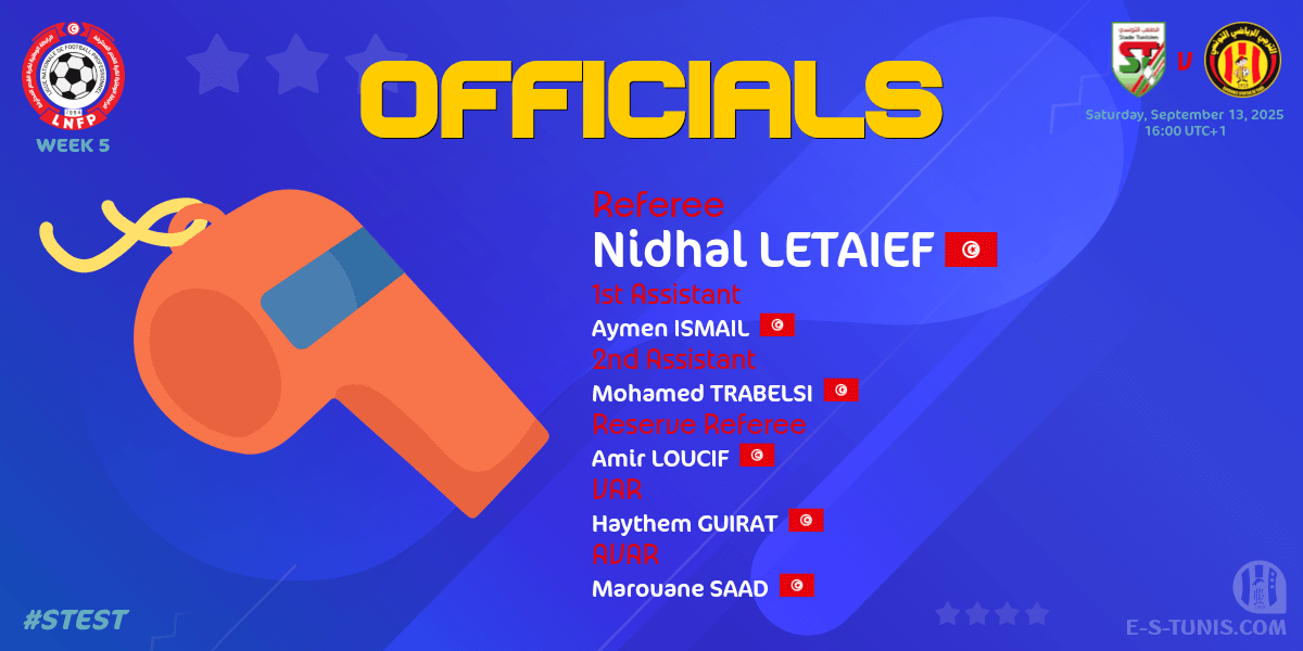 La direction nationale d'arbitrage a désigné l'arbitre Nidhal Letaïef pour officier la rencontre de la 5e journée de la Ligue 1 2025/2026 qui opposera samedi l'Espérance de Tunis au stade Tunisien à partir de 16h00 au stade Hédi Ennifer.