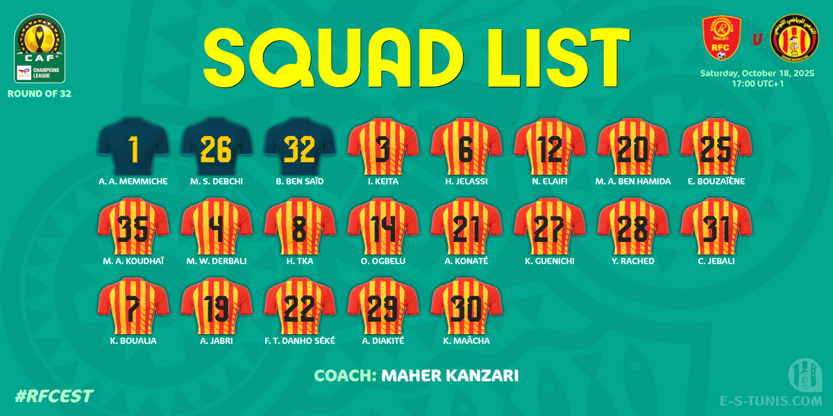 Le groupe enregistre le retour de Ben Hamida, remis de blessure, mais doit faire sans plusieurs cadres importants : Belaïli, Sasse, Tougaï, Meriah et Ben Ali, tous indisponibles pour raisons médicales.
