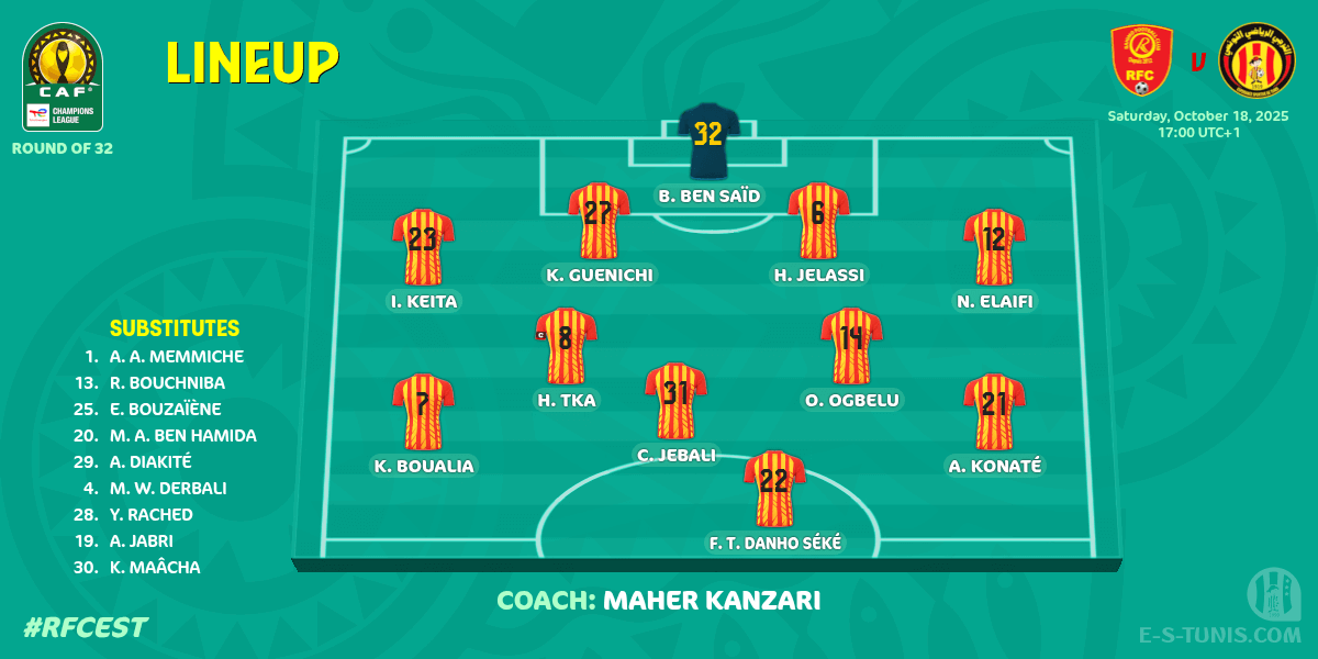 La formation sang et or qu'alignera le staff technique tout à l'heure face à Rahimo FC du Burkina Faso pour le compte du match aller du second tour préliminaire de la Ligue des champions de la CAF 2025/2026 au stade du 4 Août de Ouagadougou est la suivante : Ben Saïd, Keita, Laïfi, Guenichi, Jelassi, Ogbelu, Tka(c), Jebali, Konaté, Boualia et Danho.