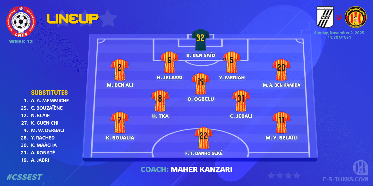 La formation sang et or qu'alignera le staff technique tout à l'heure face au CS Sfaxien pour le compte de la 12e journée de la Ligue 1 2025/2026 au stade de Radès est la suivante : Ben Saïd, Ben Ali, Ben Hamida(c), Jelassi, Meriah(c), Ogbelu, Tka, Jebali, Boualia, Belaïli et Danho.
