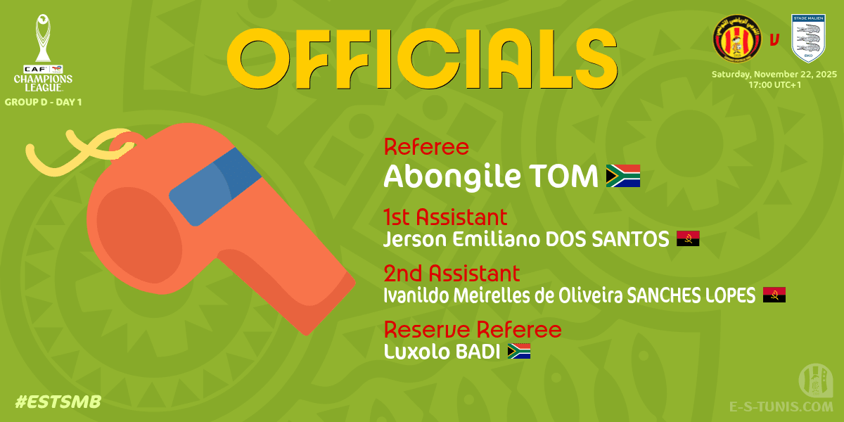 La confédération africaine de football (CAF) a désigné l'arbitre international sud-africain Abongile Tom pour officier la prochaine rencontre de l'Espérance de Tunis en Ligue des champions 2025/2026 face au Stade Malien de Bamako comptant pour la première journée de la phase de poules.