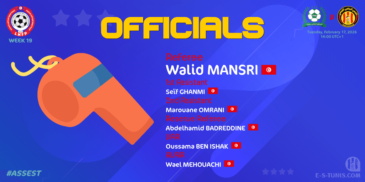 Il sera épaulé par Seïf Ghanmi (1e assistant) et Marouane Omrani (2e assistant), alors que Abdelhamid Badreddine sera le 4e arbitre. Le duo de la VAR sera composé de Oussama Ben Ishak et Wael Mehouachi.