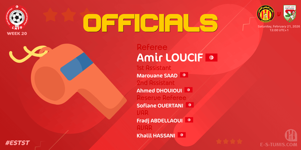 La direction nationale d'arbitrage a désigné l'arbitre Amir Loucif pour officier le deby de la 20è journée de la Ligue 1 2025/2026 qui opposera samedi après-midi l'Espérance de Tunis au Stade Tunisien à partir de 13h00 au stade de Radès.