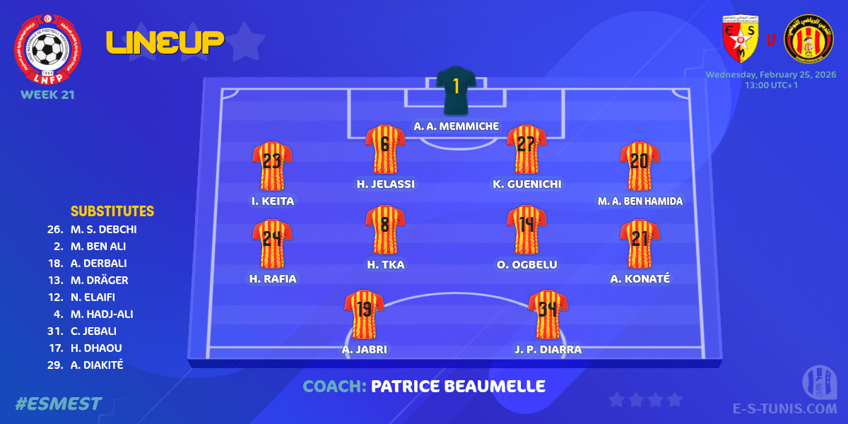 La formation sang et or qu'alignera le staff technique tout à l'heure face à l'ES Métlaoui pour le compte de la 21e journée de la Ligue 1 2025/2026 au stade municipal de Métlaoui est la suivante : Memmiche, Keita, Ben Hamida(c), Jelassi, Guenichi, Ogbelu, Tka, Rafia, Konaté, Diarra et Jabri.