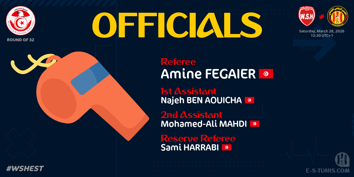 La direction nationale d'arbitrage a désigné l'arbitre Amine Fegaïer pour officier le seizième de finale de la Coupe de Tunisie 2026 qui opposera, samedi, l'Espérance de Tunis au Wided Sportif d'El Hamma à partir de 13h30 au stade municipal d'El Hamma.
